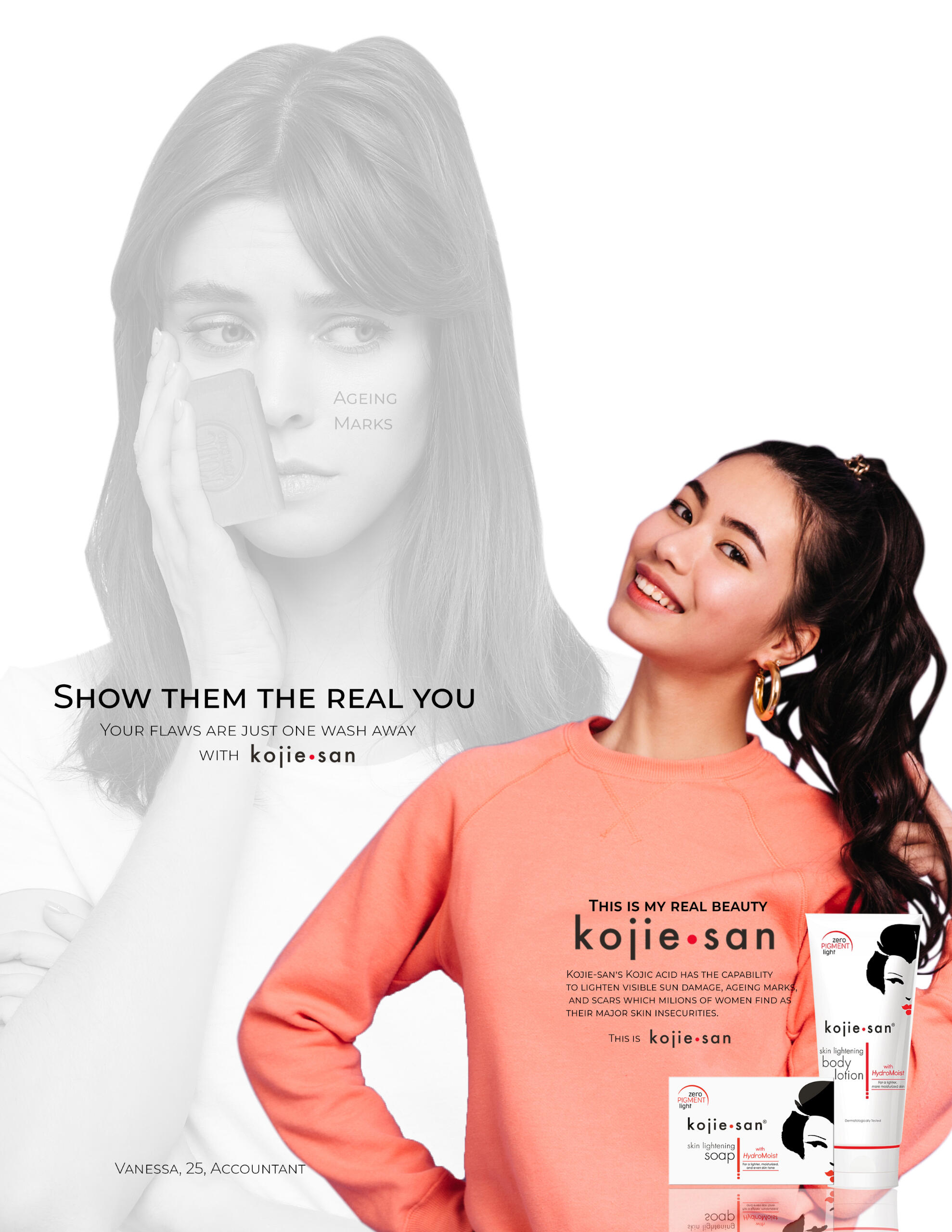 Our class was instructed to create an advertising campaign concept for the assigned brands for each team.Our team was given the brand Kojie-san, a beauty soap mainly used for whitening, alleviating ageing marks, fixing visible sun damage.The challenge however is how to convey Kojie-san's message to its market without being just the standard "whitening product". With that goal in mind, we position it as a product that empowers women's innate beauty, therefore the slogan "This is my real beauty".