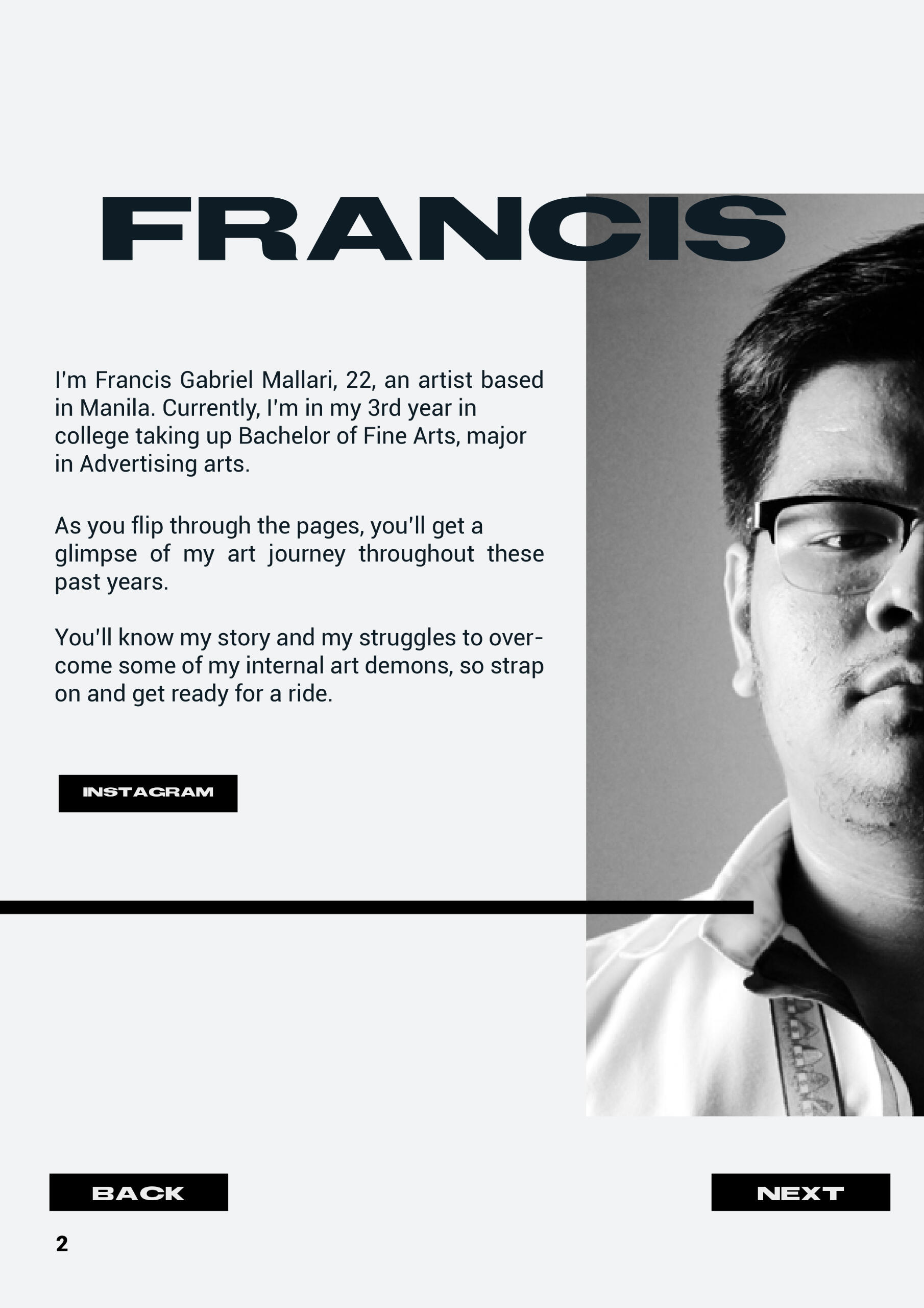 Hey there, I'm Francis Mallari, an all-around creative based in Metro Manila, Philippines.I graduated with a major in Advertising Arts at the College of Fine Arts and Design in the University of Santo Tomas in 2023.I've got hands-on experience with various digital tools such as Photoshop, Premiere, After Effects, Blender3D, and even Unreal Engine 5.Looking forward to working with you!